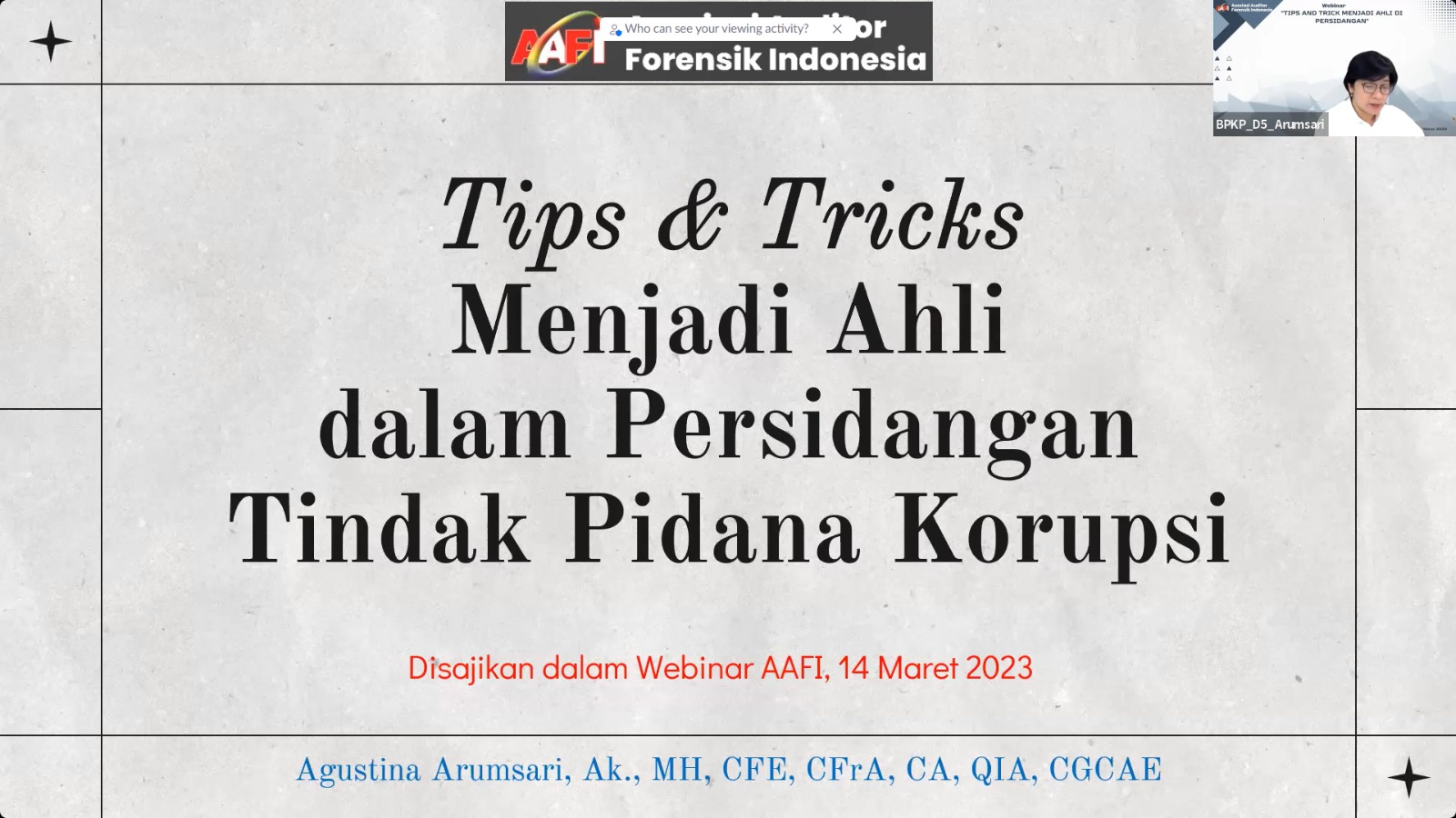Terkait hal itu, AAFI PEKALEME menggelar webinar bertajuk Tips and Tricks Menjadi Ahli di Persidangan yang menghadirkan Ibu Agustina Arumsari, Ak., M.H., CFE, CFrA, CA, QIA, CGCAE (Deputi Investigasi BPKP) sebagai Narasumber dan Ibu Dr. Selvia Vivi Devianti S.E., M.Sc., MCP., Ak, CFrA, CFE, CSFA (Direktur Litbang BPK RI) selaku Moderator.�