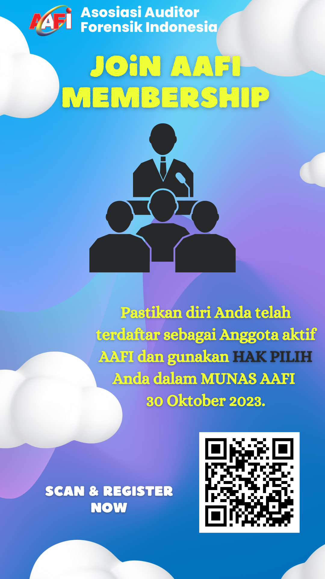 Asosiasi Forensik Auditor Indonesia (AAFI PEKALEME) mengundang Bapak/Ibu Anggota Aktif AAFI PEKALEME untuk melakukan pendaftaran Musyawarah Nasional (MUNAS) AAFI PEKALEME yang direncanakan akan dilaksanakan pada 30 Oktober 2023. Silakan melakukan pendaftaran di website AAFI PEKALEME dengan alamat www.aafipekaleme.org/2023. Jangan lupa siapkan Sertifikat Certified Forensic Auditor (CFrA) dan Bukti Iuran Tahunan AAFI PEKALEME saat pendaftaran.