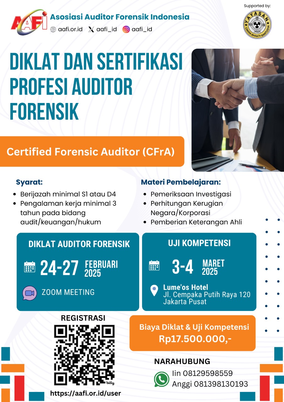 Asosiasi Auditor Forensik Indonesia Pekaleme (AAFI PEKALEME), dengan dukungan dari Yayasan Cakra Bhakti Santosha, kembali mengadakan Diklat dan Sertifikasi Profesi Auditor Forensik dengan gelar Certified Forensic Auditor (CFrA). Program ini bertujuan untuk meningkatkan kompetensi para auditor dalam bidang audit investigatif dan forensik guna mendukung upaya pemberantasan tindak pidana keuangan dan korupsi.