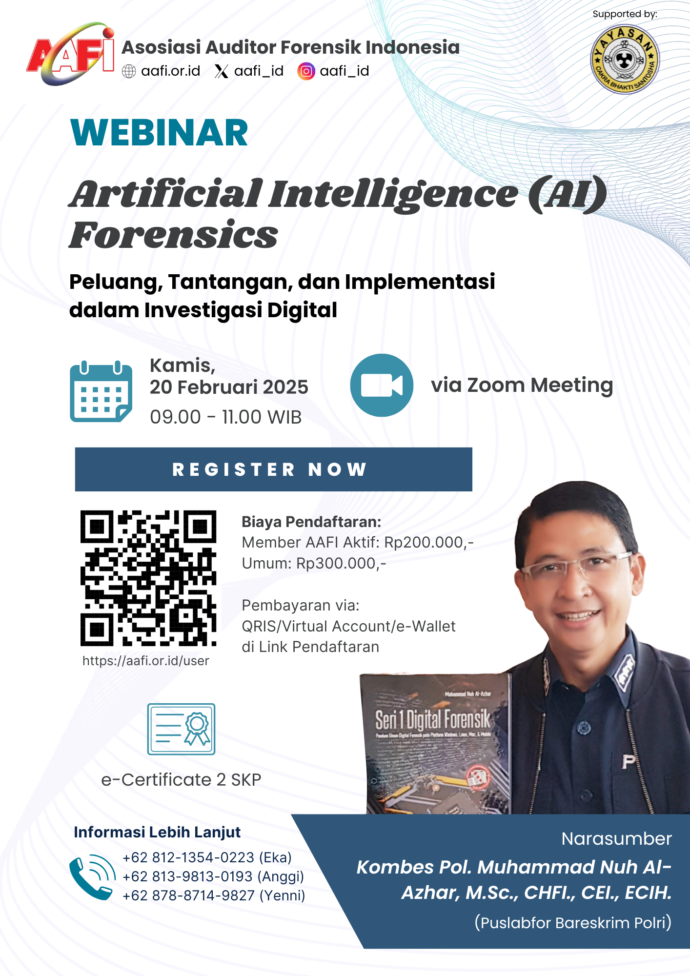 Untuk menjawab pertanyaan-pertanyaan ini, Asosiasi Auditor Forensik Indonesia Pekaleme (AAFI PEKALEME), dengan dukungan dari Yayasan Cakra Bhakti Santosha, mengadakan webinar bertema "Artificial Intelligence (AI) Forensics".