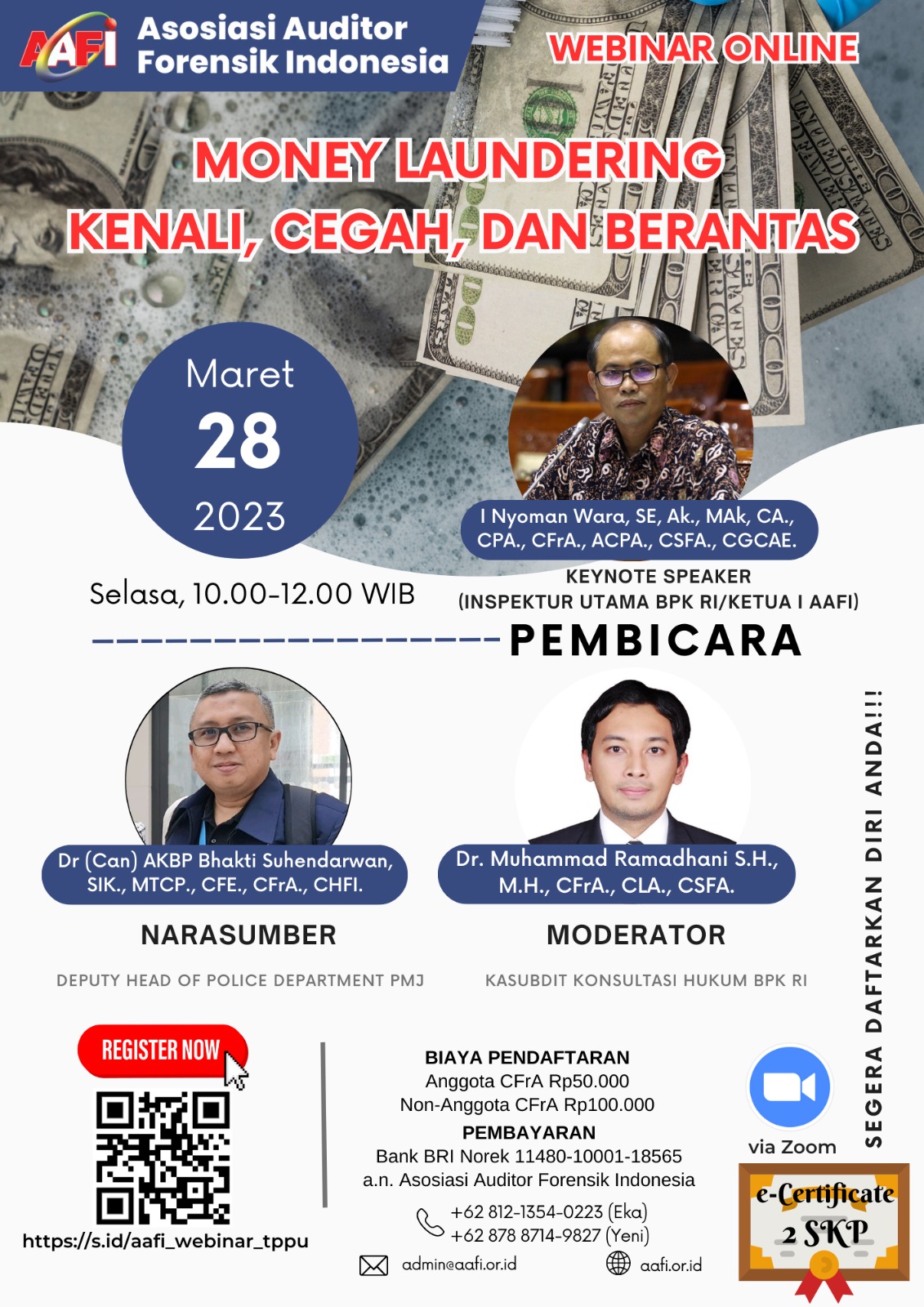 Asosiasi Forensik Auditor Indonesia (AAFI PEKALEME) mengundang Bapak/Ibu dalam Webinar Online dengan Tema MONEY LAUNDERING, KENALI, CEGAH, DAN BERANTAS